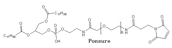 芃硕生物(Ponsure)的磷脂PEG马来酰亚胺(DSPE-PEG-Mal)可以用来修饰蛋白质、多肽以及其他含有巯基的材料或者小分子。马来酰亚胺和巯基在PH6.5-7.5很容易形成稳定的硫醚键。(DSPE)共轭聚乙二醇是磷脂和聚乙二醇结合具有亲水性和疏水性。聚乙二醇磷脂脂质体形成优质材料,可用于药物输送、基因转染和疫苗传递。聚乙二醇化磷脂能显著改善血液循环时间和稳定封装药物。这些材料还可用于靶向给药通过修改与目标表面配体如抗体、多肽。